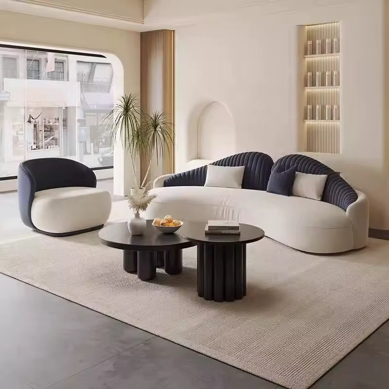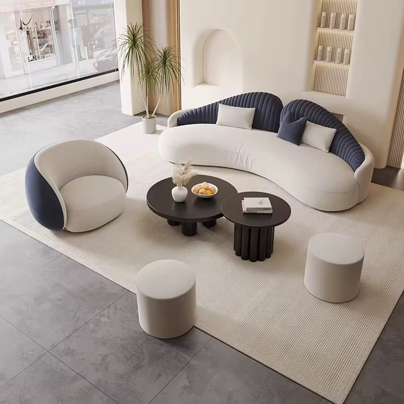 Introducing the “Ocean Breeze Lounge” – a beautifully curved, off-white sofa designed to bring a sense of calm and sophistication to your living space. Upholstered in soft, durable fabric, this sofa offers exceptional comfort with plush cushioning that invites you to relax and unwind. The navy blue accents and matching throw pillows add a refreshing pop of colour, reminiscent of a gentle ocean breeze, creating a serene and stylish atmosphere. Perfectly paired with a coordinating armchair and elegant coffee tables, the “Ocean Breeze Lounge” is crafted to elevate both comfort and modern design in your home.